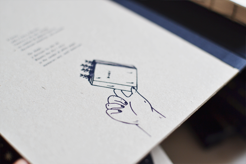Contém ainda a escrita criativa de uma terceira pessoa - Frederico Marques - que acrescenta o "algo mais" que sentia que esta coleção precisava. Uma espécie de extra que se descobre apenas quando se abre o caderno. O Frederico "ilustra" na perfeição, e em pouquíssimas palavras, a ilustração da Mariana, que explora o diário como um local onde depositamos as ideias, projectos ou memórias.