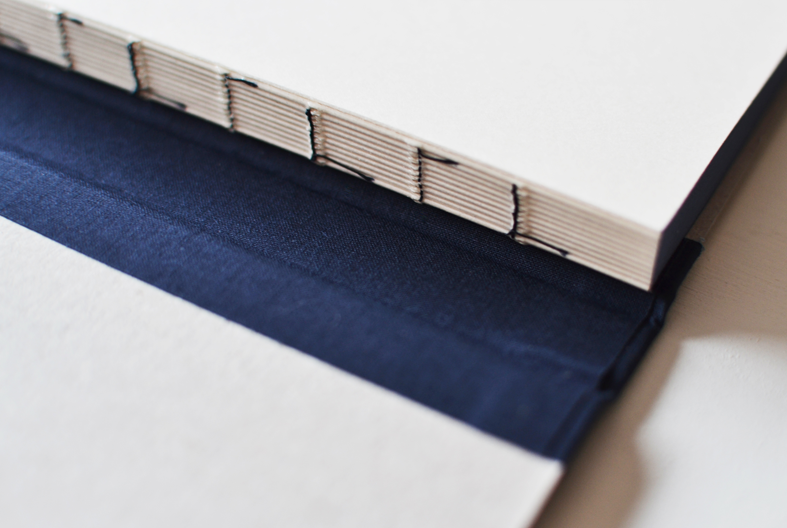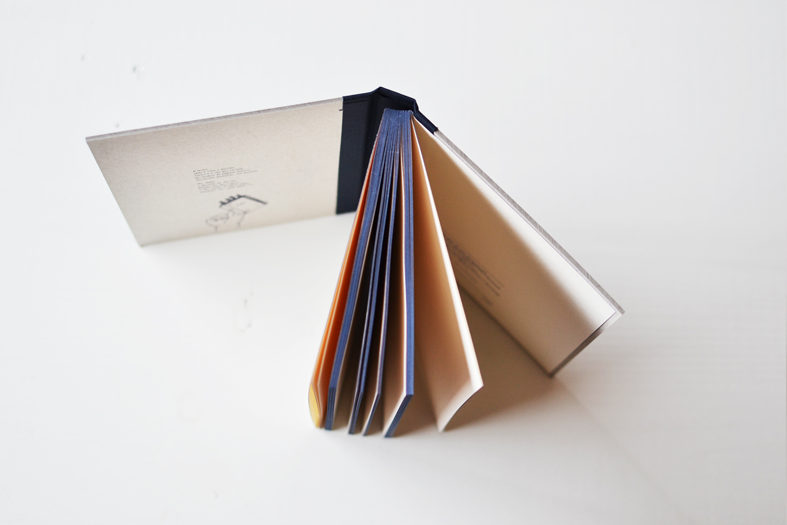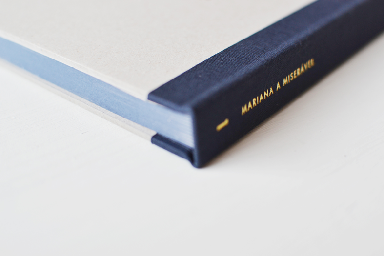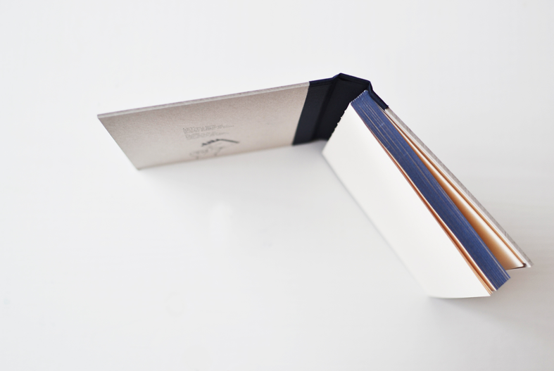 I got that through the format, the choice of materials and the combination of a series of printing/finishing processes: the hand pulled screen print on grey cardboard - a material normally used to reinforce notebooks and not used on the exterior - combined with textile material that covers just the book spine. The mechanic stitching that involves the notebook interior and that is normally hidden behind the book spine is admittedly visible. The outside of the interior pages is painted with the main color of the notebook (dark blue) making you believe - when the notebook is closed - that the pages are the same color, when you open it you see the cream colored paper. The traditional debossed golden stamp that contrasts with the rustic look of the grey cardboard.